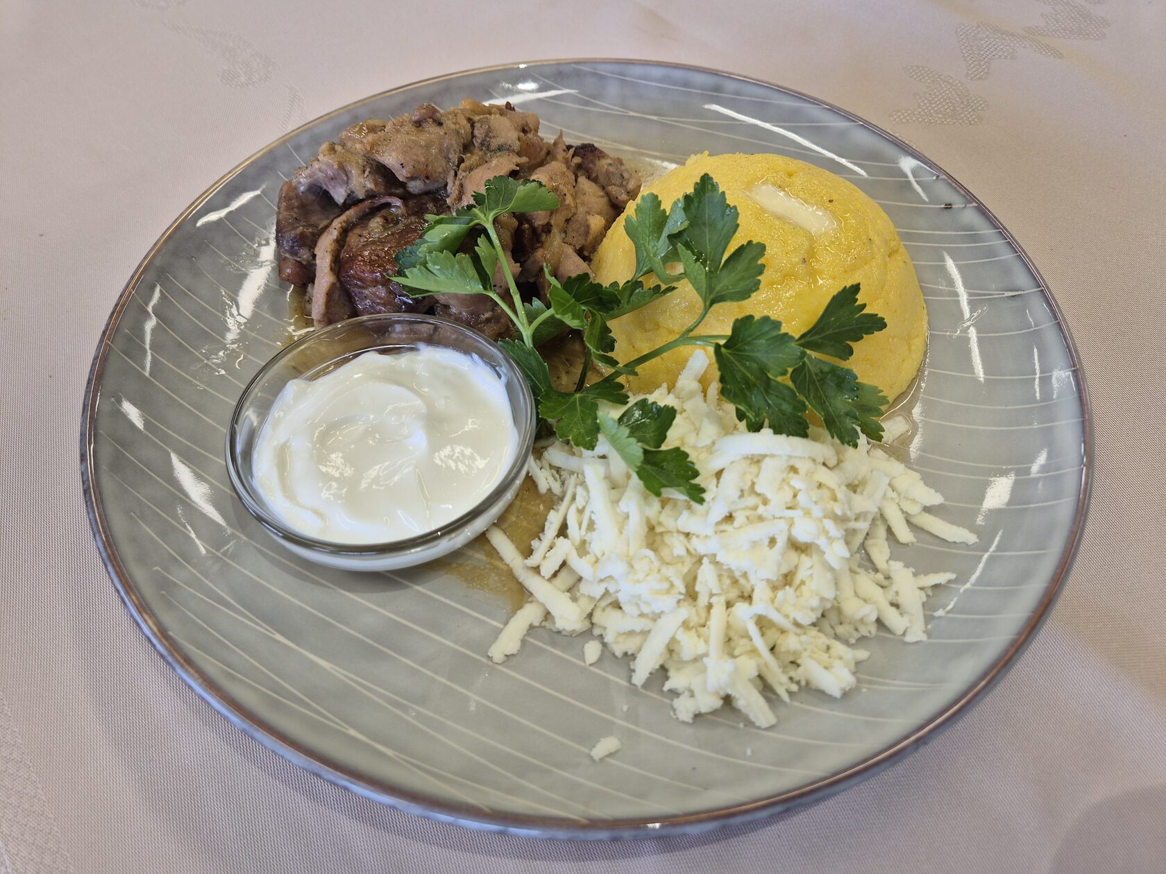 (carne de porc, mămăligă, brănză, smântână, unt, condiment, verdeață)