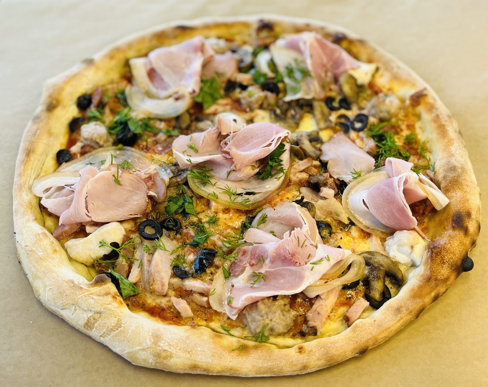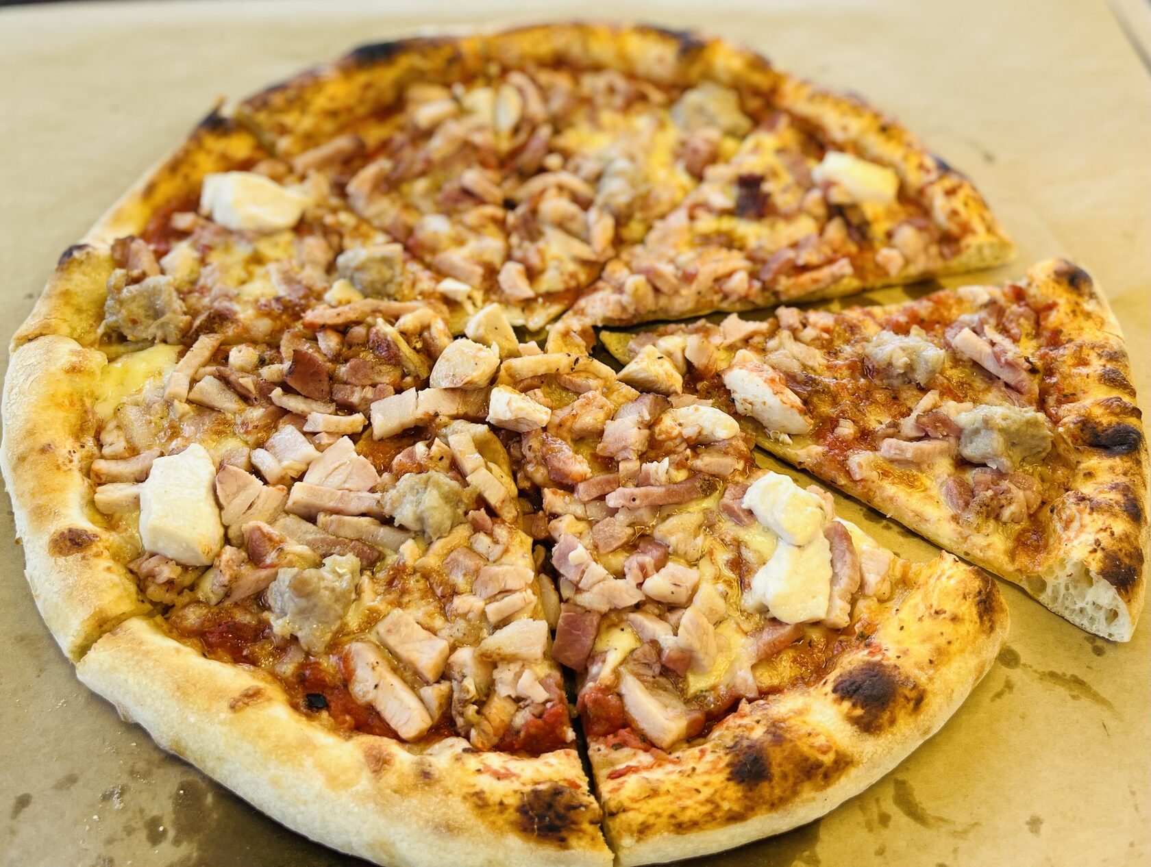 (Blat, sos de roșii, mozzarella, șuncă, bacon, salsiccia,piept de pui, ciuperci,