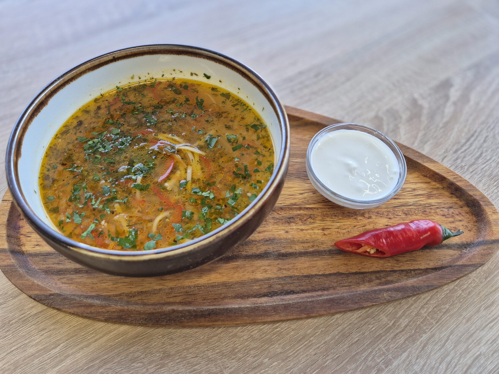 (bulion din pui, tăiței de casă, morcov, ceapă, ardei dulce,