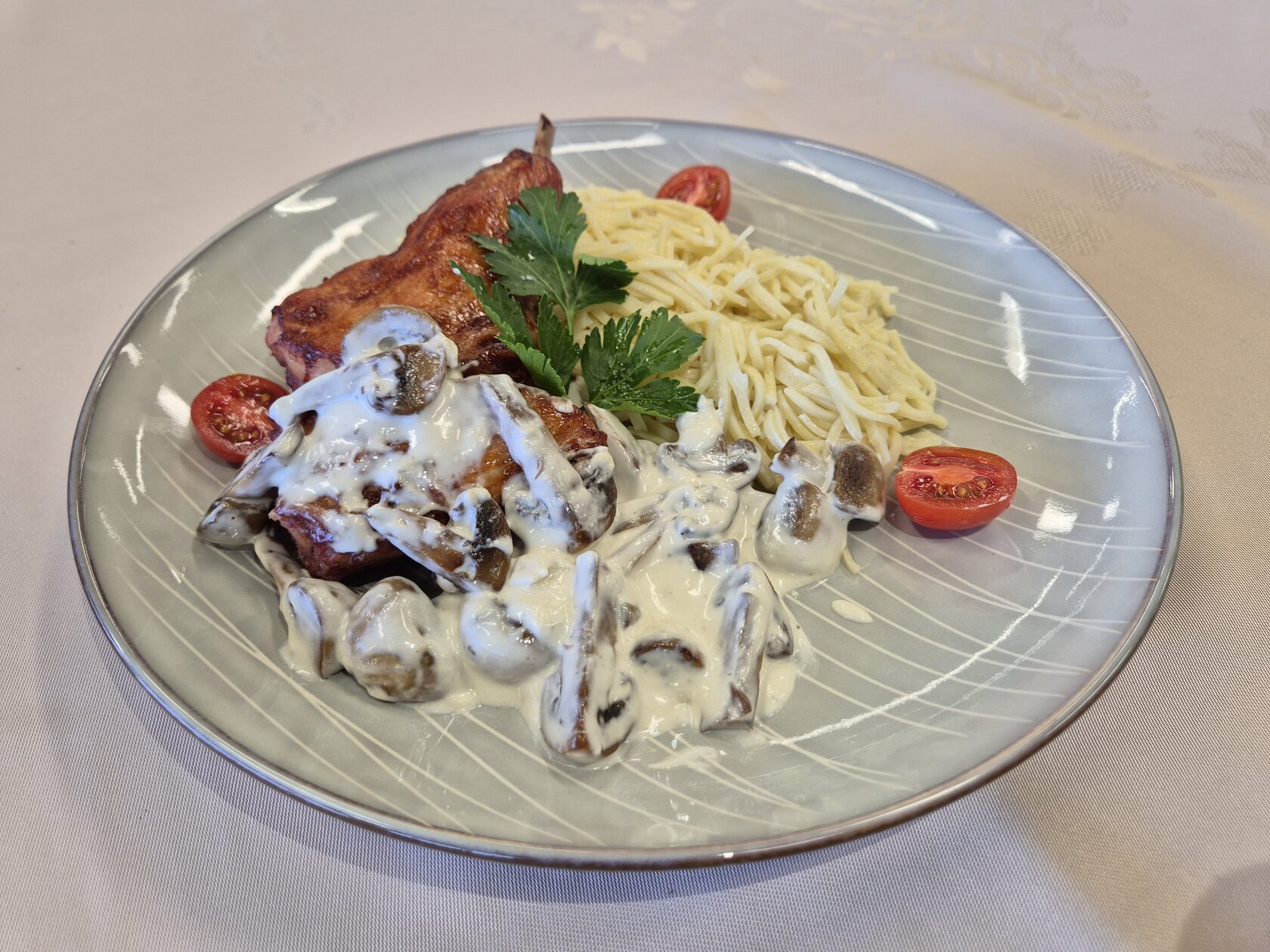 (pulpă de iepure, tăiței de casă, sos din ciuperci)