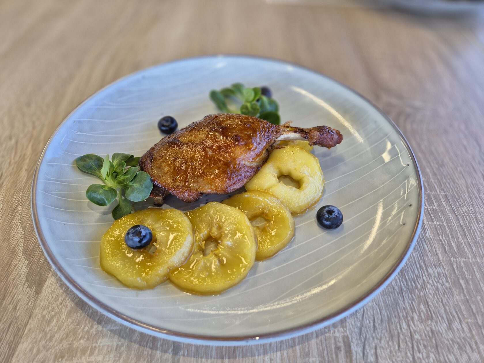 Pulpă de rață cu mere caramelizate 1/200/100 ................................................................................................