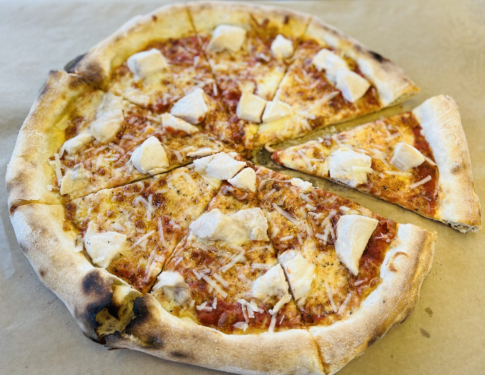 (Blat, sos de roșii, mozzarella, piept de pui, parmesan)