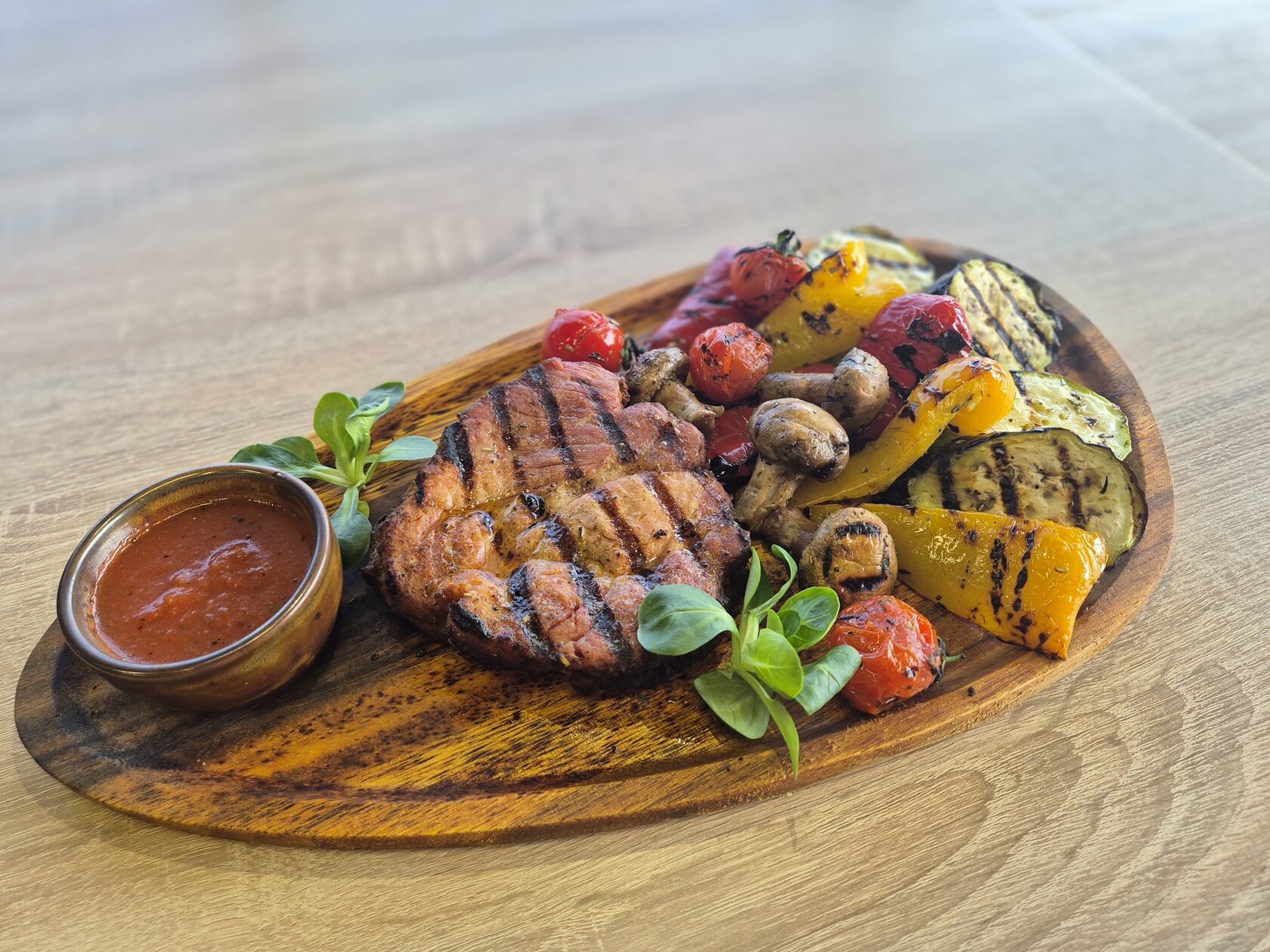 (ceafă de porc, ardei kapia, vinete, roșii, ciuperci, sos)