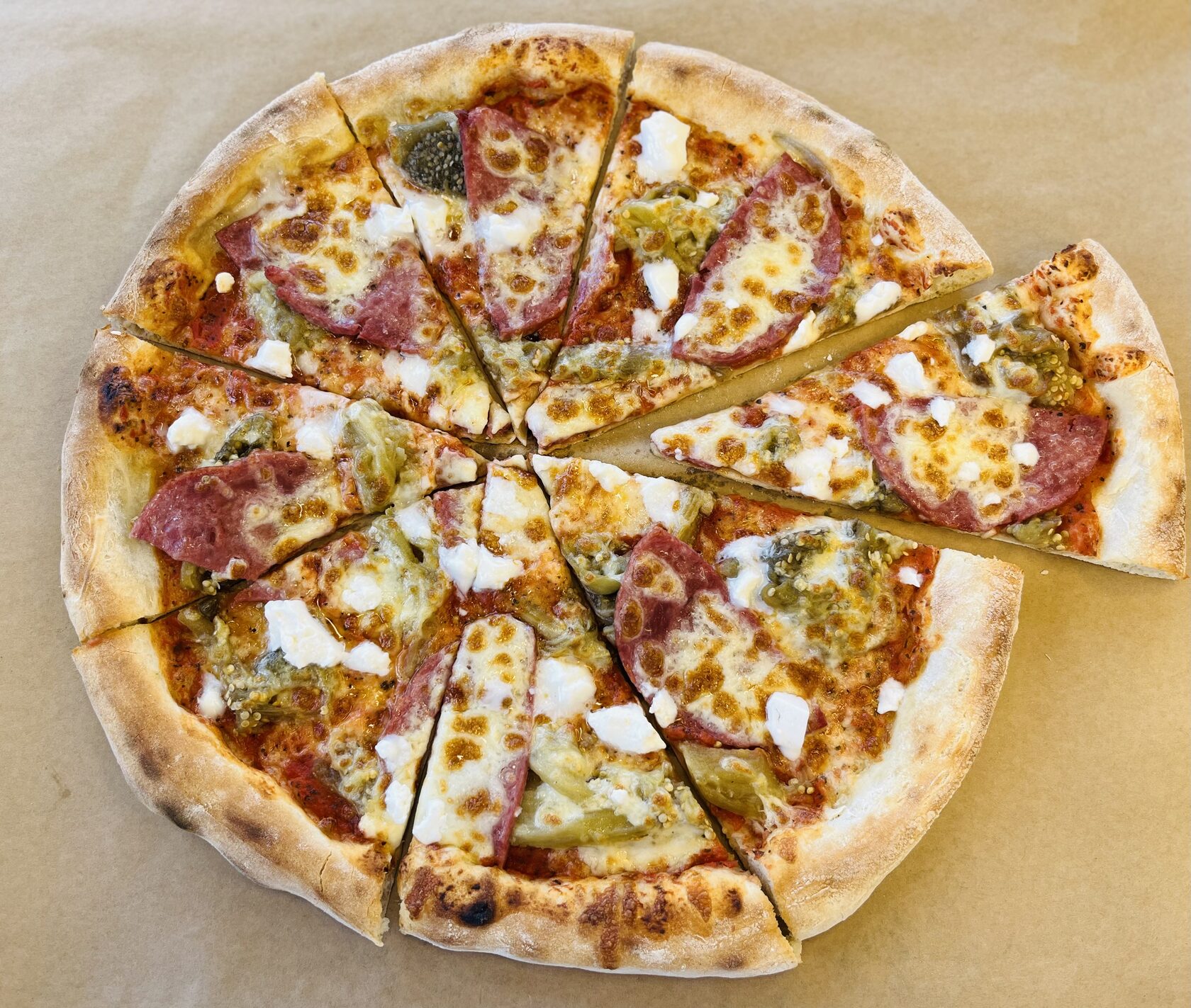 (Blat, sos de roșii, mozzarella, saliami, ardei chili)